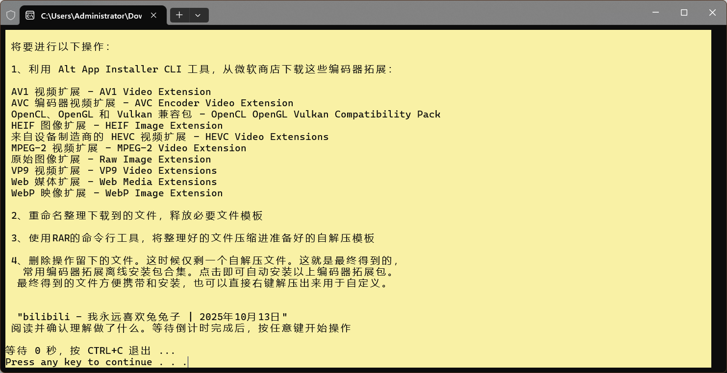 好了。于是就得到一个,基于rar自解压释放到temp然后安装的,微软商店常用多媒体编码器拓展离线安装包合集。